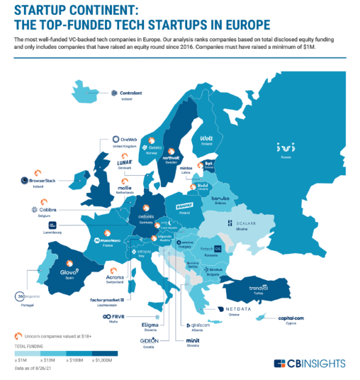 Распределение стартап-экосистем и инвестиций в Европе. Источник: платформа аналитики рынка технологий CB Insights.