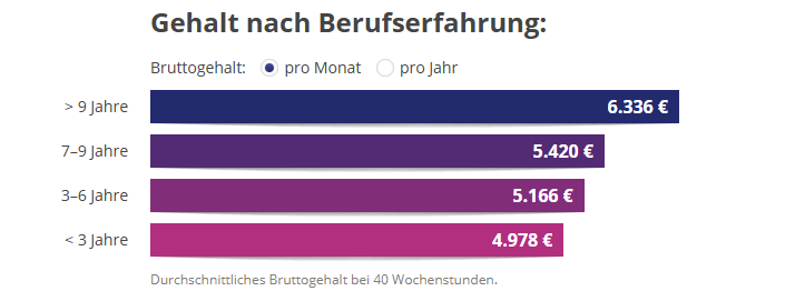 Средний диапазон зарплат разработчика в Германии составляет примерно €58 000–88 000 в год брутто, медиана около €6 000 в месяц (данные Bundesagentur für Arbeit). Но претендовать на высокие цифры на старте карьеры не стоит, доход повышается постепенно, с опытом — согласно базе Gehalt, медианные показатели по стажу выглядят так: